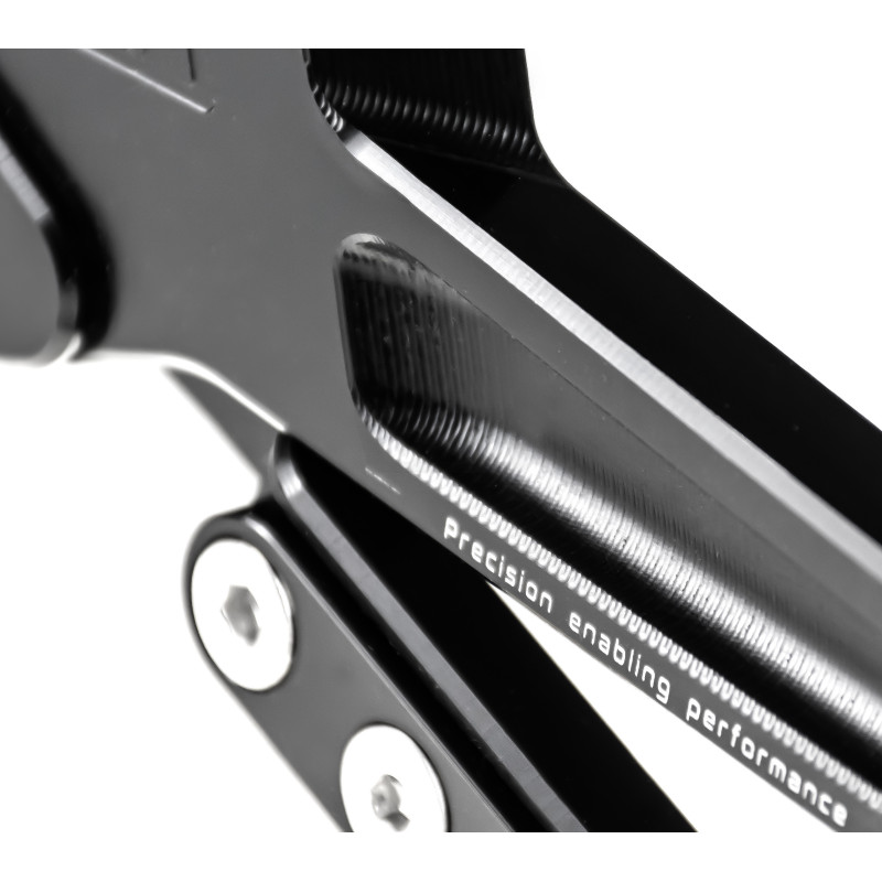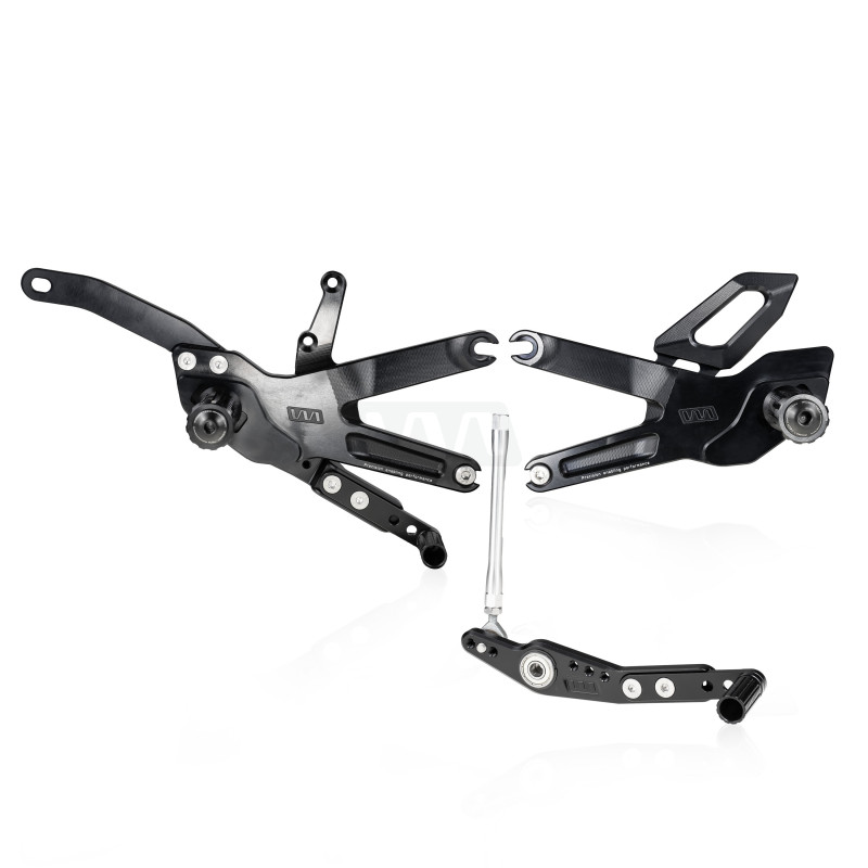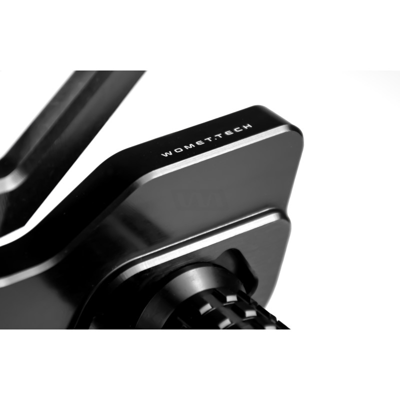A set of lightweight yet highly durable footpegs that allow for individual adjustment depending on the riding position. - Unique WMT design, manufactured to racing specifications. - Double-bearing levers on ball bearings ensure zero play. - Levers with 3-point linkage mounts for standard and reverse shifting. - Slider length can be adjusted in three positions to fit any foot size. - Machined for high rigidity and precise control while maintaining low weight.